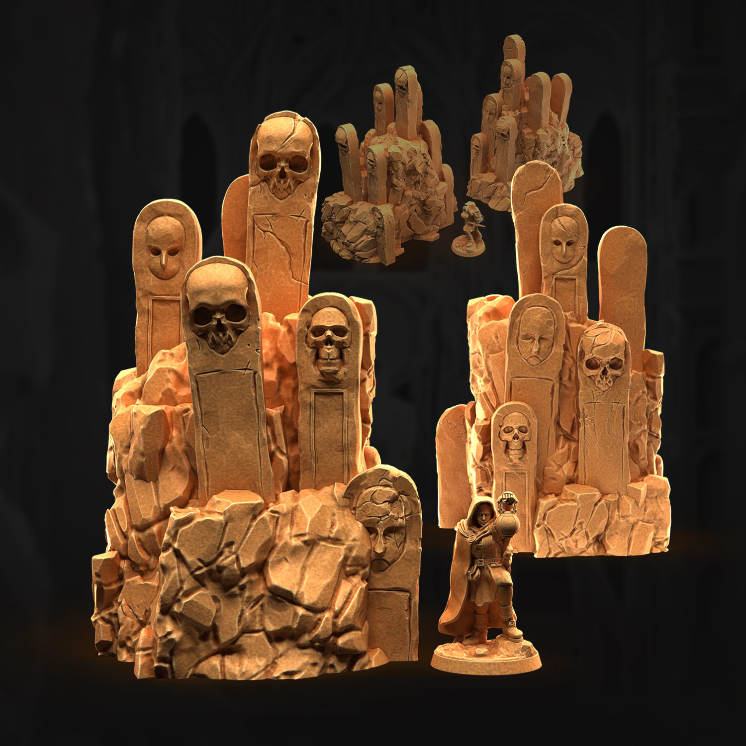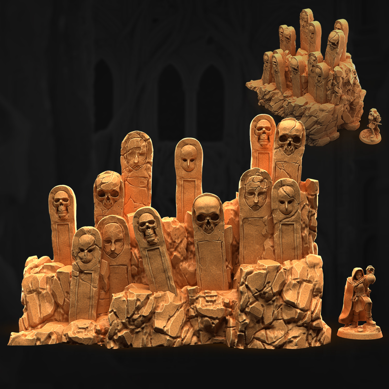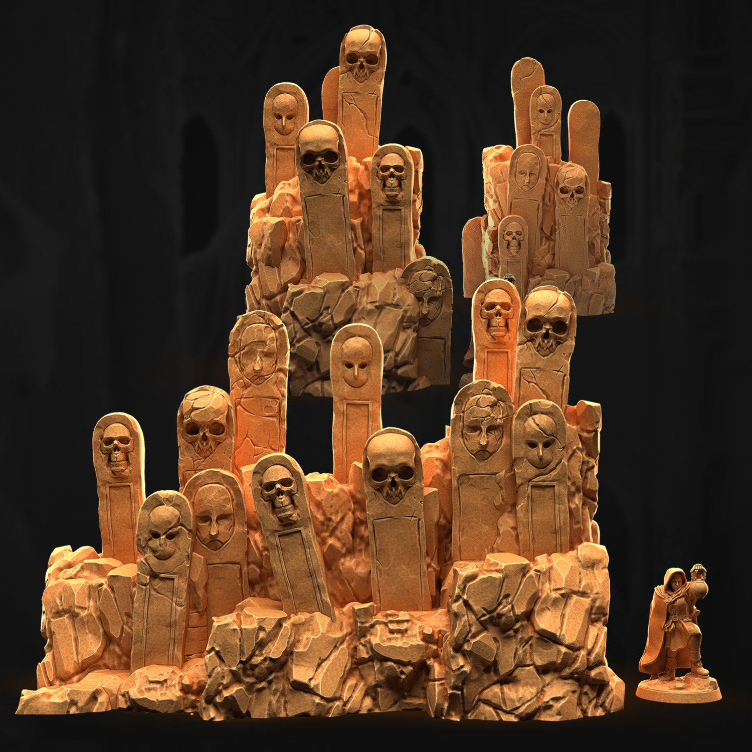 Un gros rocher et deux petits, couverts de tombes
